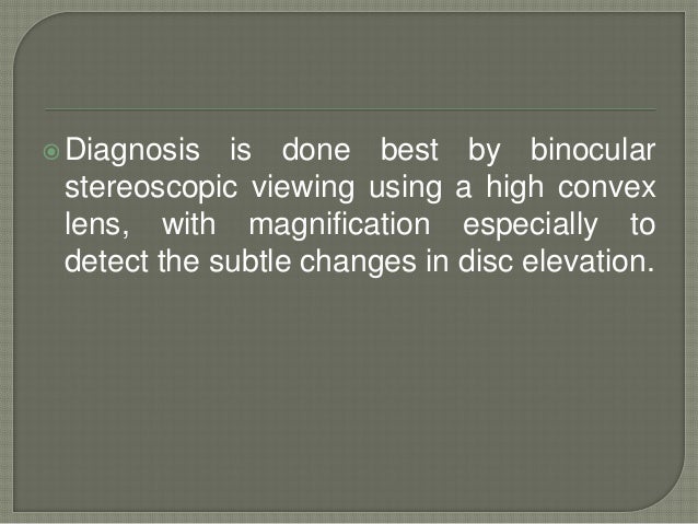 - Diagnosis is done best by binocular stereoscopic viewing using a high convex lens, with magnification especially to detect the subtle changes in disc elevation.