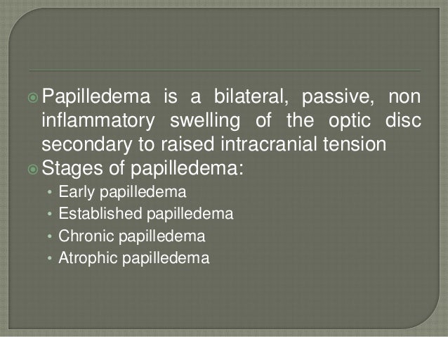 - Papilledema is a bilateral, passive, non inflammatory swelling of the optic disc secondary to raised intracranial tension Stages of papilledema: • Early papilledema • Established papilledema • Chronic papilledema • Atrophic papilledem