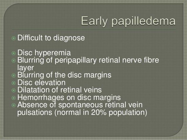 - Difficult to diagnose Disc hyperemia Blurring of peripapillary retinal nerve fibre layer Blurring of the disc margins Disc elevation Dilatation of retinal veins Hemorrhages on disc margins Absence of spontaneous retinal vein pulsations (normal in 20% population)