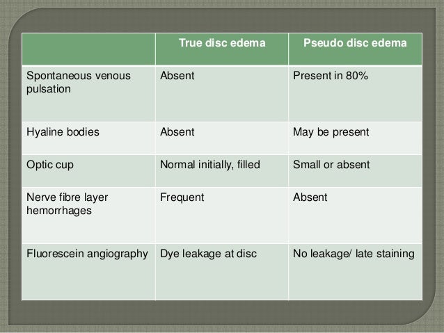 - True disc edema Pseudo disc edema Spontaneous venous pulsation Absent Present in 80% Hyaline bodies Absent May be present Optic cup Normal initially, filled Small or absent Nerve fibre layer hemorrhages Frequent Absent Fluorescein angiography Dye leakage at disc No leakage/ late staining