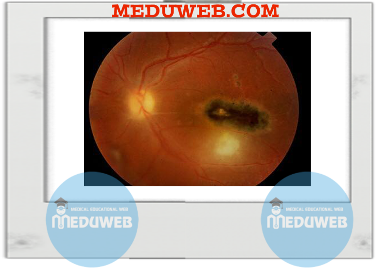 ☝️ retinochoroiditis (more commonly bilateral and affecting the macula).